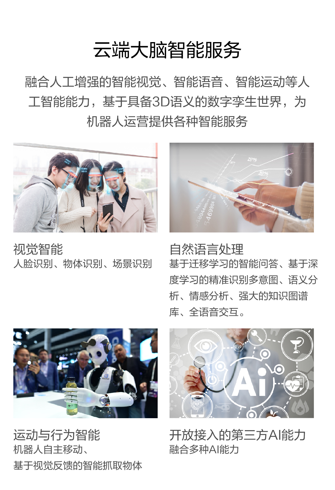 融合人工增强的智能视觉、智能语音、智能运动等人工智能能力,基于具备3D语义的数字孪生世界,为机器人运营提供各种智能服务